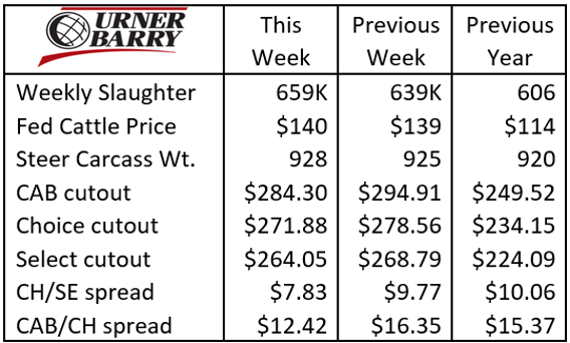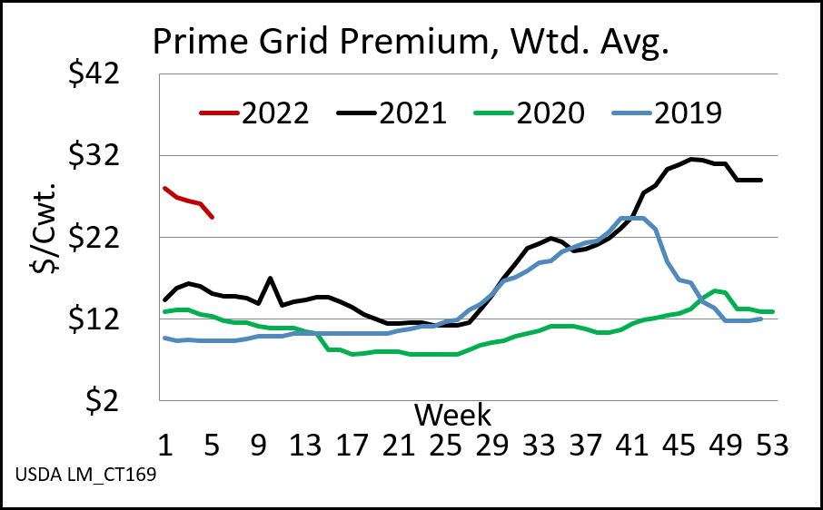 Carcass weights are back on the rise, with the most recent 928 lb. steer carcass weight reaching back up to touch the early Jan. high. Despite some true winter weather in the northeast and southern feeding regions, there is a vast area of dry and temperate conditions in the high plains with good conditions that continues to push weights higher. Additionally, in the month of Jan. we failed to harvest about 100K head of cattle that “could have” been slaughtered, had labor issues not plagued the industry again with further COVID ramifications. The wholesale beef market was firmly lower last week with some items touching 52-week price lows. The most valuable middle meat cuts, ribeyes and tenderloins, led the downward price decline. CAB brand tenderloins have declined from $14.50/lb. in mid-January to last week’s $11.80/lb. market average, the most dramatic decline in that period since 2007. The difference, of course, is the record-high recent Jan. price prior to the drop. Strip loins and top butts are on an increasing price trend and will likely only see a brief pullback as we move toward the spring demand period. Economic inflation continues to be a headline and concerning to the beef marketplace. However, if weekly slaughter numbers continue to show the kind of improvement seen last week then there is hope for beef end users that larger production can support lower wholesale prices.