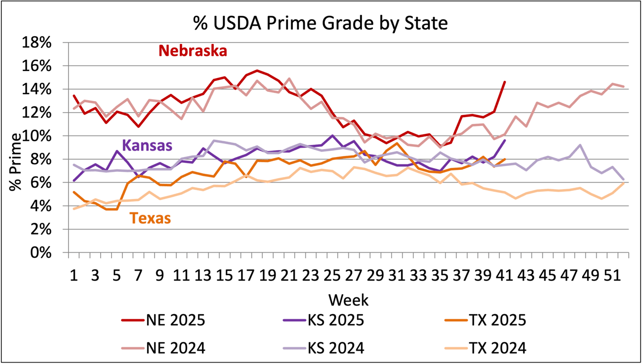 A final optimistic note for cattlemen is the widening of the USDA Prime cutout price spread above USDA Choice; the latest spread is $57/cwt. This bolstered average Prime grid premiums to $22.42/cwt. earlier this month and comes at a time when Prime carcass production is seeing an uptick. Nebraska takes the prize among the largest packing states as feeders in the region are delivering 14.6% Prime carcasses to packers, a big move from the 10% level seen the same week last year. Kansas and Texas grade trends are similarly impressive, with Kansas up to 9.7% and Texas closing the gap at 8% Prime.