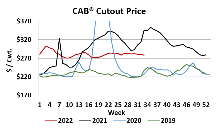 The June 2022 high CAB cutout value of $2.84/cwt. was just 3% higher than last week’s $2.75/cwt. value. Although the CAB cutout did not rally in the anticipated fashion ahead of Labor Day, the resilience of pricing since mid-June suggests stable demand.